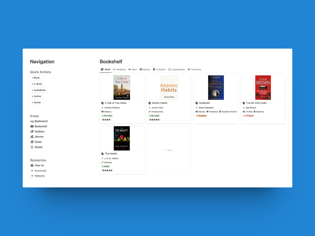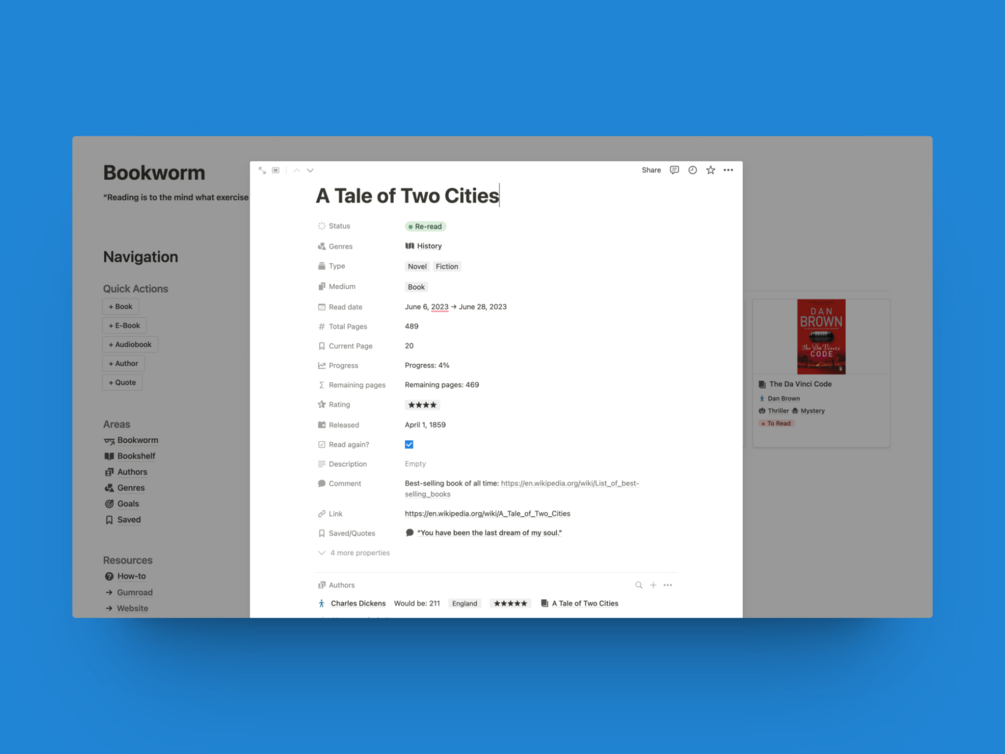 Connected to this Bookshelf are multiple databases for authors with their own details, genres, goals, and quotes or saved content from each book.