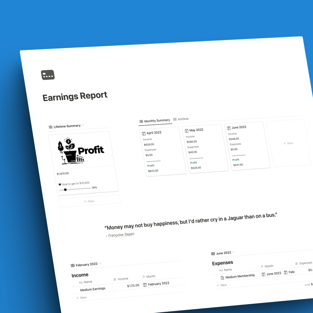 Earnings Report is a template for Notion. It can either be used as a standalone template or as an add-on for Write OS, my comprehensive system for online writers. Write OS customers get the Earnings Report template for free, as well as other future add-ons.